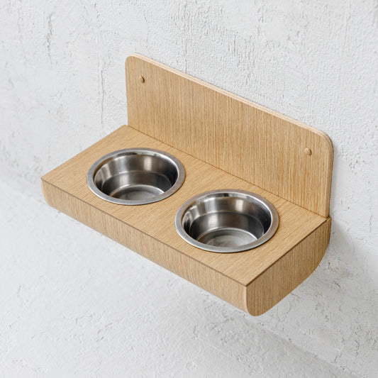 Hanging wooden dog feeder with wall protection, Floating raised dog bowls
